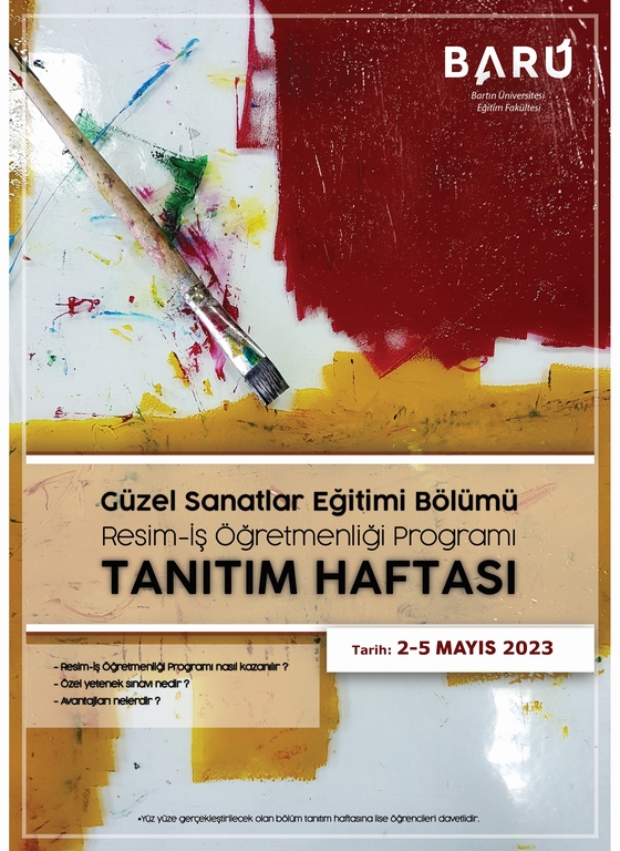 Güzel Sanatlar Eğitimi Bölümü Resim-İş Öğretmenliği Programı Tanıtım Haftası 2-5 Mayıs 2023 tarihleri arasında gerçekleşecektir.Yüz yüze gerçekleştirilecek olan bölüm tanıtım haftasına lise öğrencileri davetlidir.