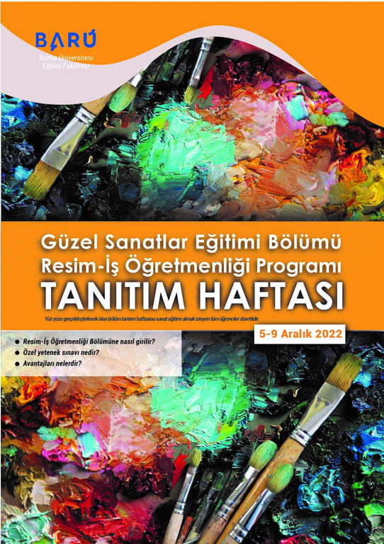 Güzel Sanatlar Eğitimi Bölümü Resim-İş Öğretmenliği Programı Tanıtım Haftası 5-9 Aralık 2022 tarihleri arasında gerçekleşecektir.Yüz yüze gerçekleştirilecek olan bölüm tanıtım haftasına sanat eğitimi almak isteyen tüm öğrenciler davetlidir.